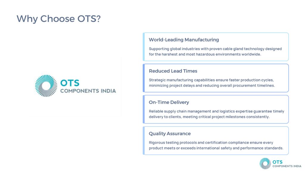 OTS is a global leader in the design and manufacture of cable glands and accessories for hazardous and industrial environments. OTS products are engineered to meet and exceed international safety standards including ATEX, IECEx, and UL certifications.